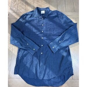 Clean pre-owned Billy Reid Men's Standard Fit Button Down Shirt in blue with a subtle stripe pattern. Made with Billy Reid's premium soft woven fabric and classic Southern tailoring. Size XXL. Long sleeve design with collared neckline and button barrel cuffs.
