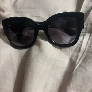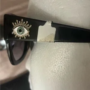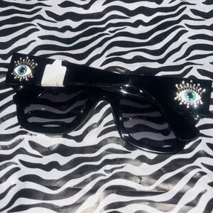 Chic black sunglasses with striking eye accents. Ideal for a bold fashion statement.
