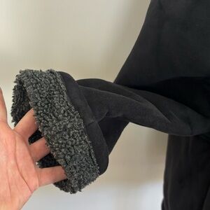 Black with gray faux fur detailing around the pockets, collar, and lined