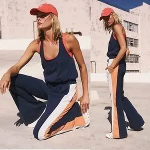 Features: Soft fabrication with a stretchy feel, scoop neckline, sleeveless-style with low-cut armholes, smocked elastic waistband with adjustable drawstring, pockets for hands, striped detailing, slits at bottom hem of legs, racerback design