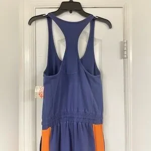Designed for pre- or post-workout, this sleek onesie is featured in a soft fabrication and sleeveless silhouette with a smocked waistband and striped detail at the legs.