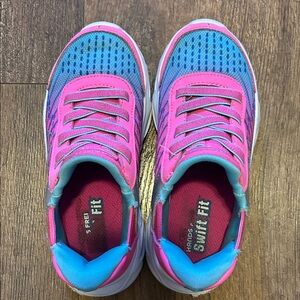 Colorful sneakers with pink and blue design. Ideal for active kids. Parents, these are awesome for your kiddo to dress solo. The feature swift-fit, step-in, hands-free technology. She wore these for the beginning of school, but her feet grew quickly. In very good used condition.