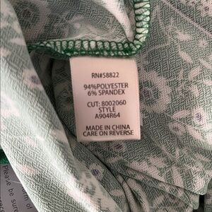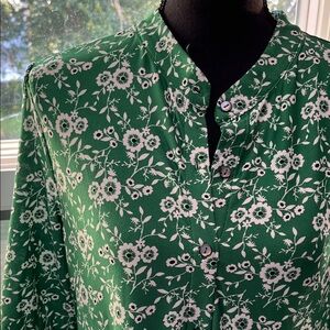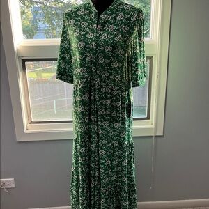 Elegant green dress with white floral pattern. Features short sleeves and button-up front. Perfect for casual or formal occasions.