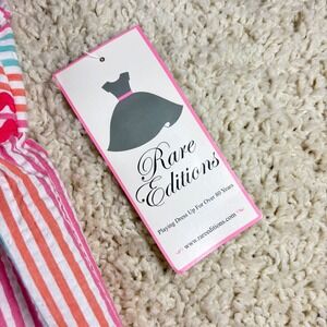 Delight your little one with this adorable Rare Editions dress, bursting with sweet charm and playful style. The vibrant seersucker fabric, adorned with cheerful stripes of pink, blue, and orange, creates a lively backdrop for the darling cupcake appliqués adorning the pockets. A delicate pink ric-rac trim cinches the empire waist, adding a touch of feminine flair to the gathered skirt. Perfect for a birthday party, a summer picnic, or a fun day out.
