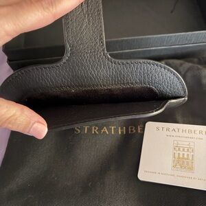 Chic black leather sunglass case by Strathberry. Features elegant design with signature detailing. Comes in original box ready for gifting.