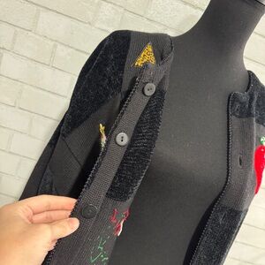 Celebrate the season with this adorable black checkered cardigan featuring colorful holiday appliqués of Christmas trees and wreaths in different patterns, textures and beaded accents! There buttons along the interior for closure so the beaded tree buttons go undamaged. Medium to heavy weight material.