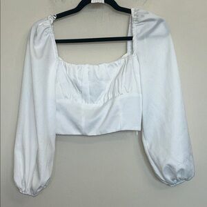 Chic white crop top with puff sleeves. Perfect for stylish outings. Pair with high-waisted pants.