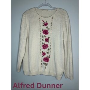 Alfred Dunner Cream Embroidered Floral Sweater Pink Roses Vintage Cottagecore