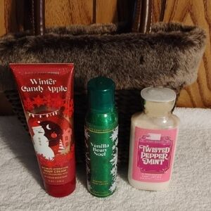 Experience holiday joy with this Bath & Body Works set. Includes Winter Candy Apple, Vanilla Bean Noel, and Twisted Peppermint.snd the bag to put them in Perfect for seasonal pampering.