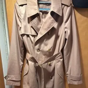 Stylish double-breasted trench coat. Features a classic belt and button details. Ideal for versatile wear.