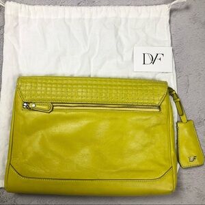 Gently used quilted clutch. Silver hardware with no tarnish. There is a little break at the seams as shown in picture and a little mark that can be buffed out not too noticeable. The inside of clutch is clean and lining in tact. DVF clutch comes with dust bag and care card.