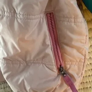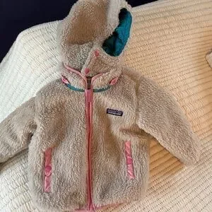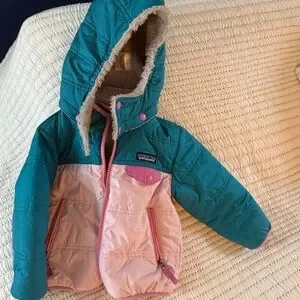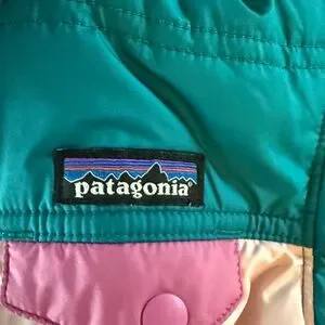 Vibrant teal jacket with pink accents. Features Patagonia logo.