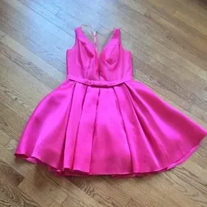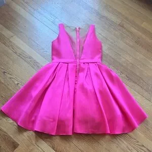 Elegant pink midi dress with a sleeveless design. Features a fitted bodice and flared skirt. Perfect for special occasions. Worn twice. Some staining, would need to be professionally cleaned-see pics. Dress has been taken in from original size.