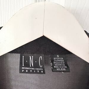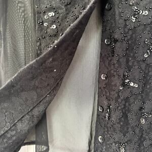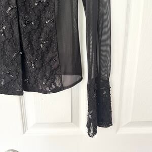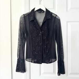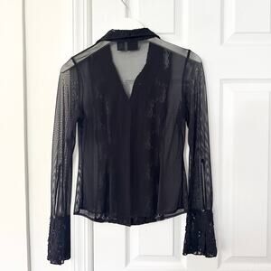 Size small petites from INC. Black mesh long sleeve button down collared top . Has black lace trim along sleeve cuffs and front chest with sequin and beads accents. Whimsygoth goth witchy core. Preowned in good condition with no stains or tears.