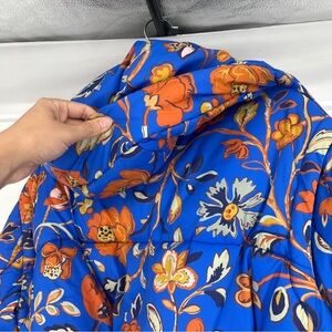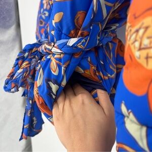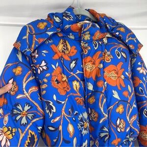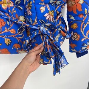 RHODE Blue Orange Floral Wrap Hooded Winter Designer Boho Puffer Coat Small NWOT