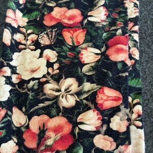 Deep v-neck with flattering gathering over midriff. Elegant floral pattern. Full length sleeves