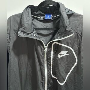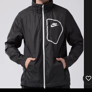 Nike sportswear Lightweight black jacket with white accents. Features Nike logo on chest. Ideal for outdoor activities.