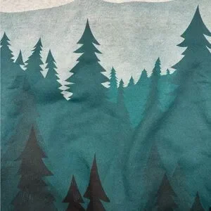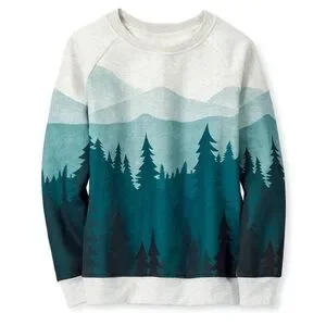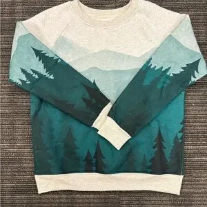 Cozy sweatshirt with a forest print design on front, back and sleeves. Features shades of green, teal and gray.