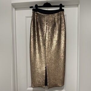 Elegant gold sequin midi skirt. Perfect for evening wear. Shimmering design by Cinq à Sept.