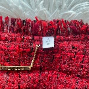 Keywords: Chico's, tweed blazer, red jacket, collarless, metallic threads, fringe trim, textured, sophisticated, evening wear, business casual, party attire, statement piece, designer