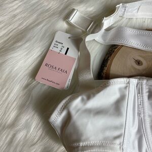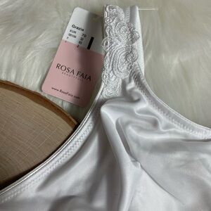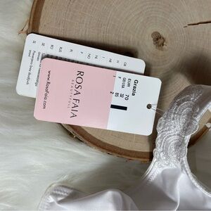 Rosa Faia Grazie white underwired full cup bra. Size: 32 I. Stretch fabric, single layer molding cups, adjustable straps. 62% polyester, 28% nylon, 10% elastane.