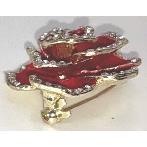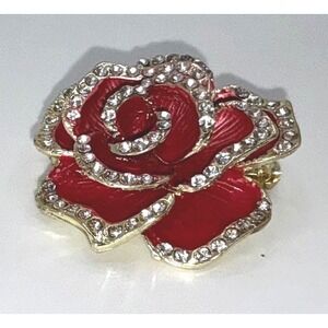 Red Rose Enamel Rhinestone Brooch Pin Gold-Tone 1.25" Floral Statement