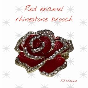 rose brooch, floral pin, rhinestone brooch, red enamel pin, gold tone brooch, vintage style brooch, statement pin, holiday brooch, romantic jewelry, floral accessory
