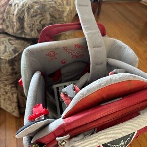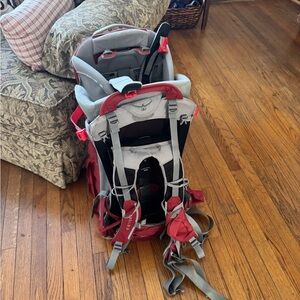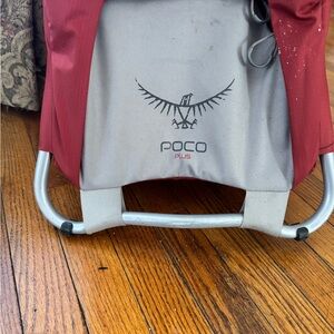 Osprey poco plus child carrier in vibrant crimson and sleek gray and red. Designed for comfort and durability.