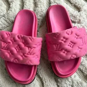 Stylish pink sandals with embossed logo. Comfortable slide design. Perfect for casual wear.