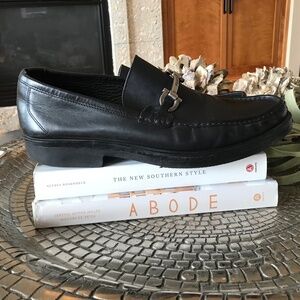 Salvatore Ferragamo black loafer with silver Ferragoma logo horse bit.