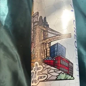 Colorful New York themed insulated water bottle. Features iconic city landmarks.