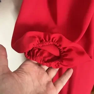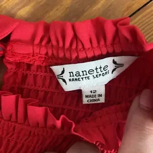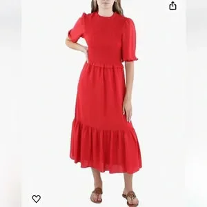 This new, without tags, Nanette Lepore smocked midi dress is a beautiful brick red color. It has ruffle details at the neckline, waist, and sleeves, a tiered skirt, and a keyhole button closure at the back of the neck. The dress is lined.
