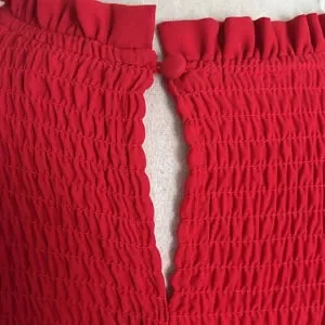 Style tags: Nanette Lepore, midi, midi skirt, red, brick red, fall, ruffle, tiered skirt, smocked, prairie, fall, prairie dress, cottagecore, cottage