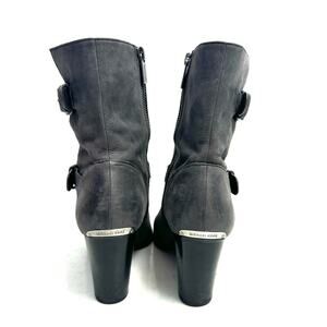 Excellent used condition! Genuine leather gray booties! Silver buckle accents and spell-out silver logo on back heel. Round toe with a short black stacked block heel. Great for fall and winter.