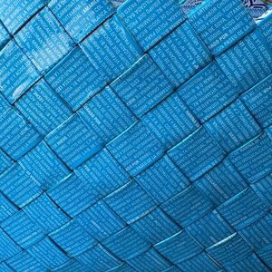 The bag is primarily a bright blue color, with white and blue wrappers forming the strap.