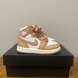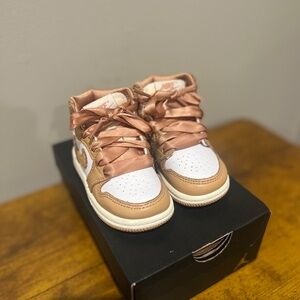 Kids Jordan Retro 1 in Tan/Gold and white with Satin Laces sz 5