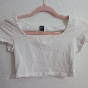 Trendy cream crop top with a square neckline. Perfect for casual outings.