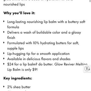 Do your lips a flavor. This nourishing tinted lip balm slicks your lips in buttery moisture, buildable tint and a glossy finish that's addictive. Formulated with a 10% butter blend plus a hyaluronic acid blend, the richly hydrating formula melts into lips and leaves them feeling soft and supple.