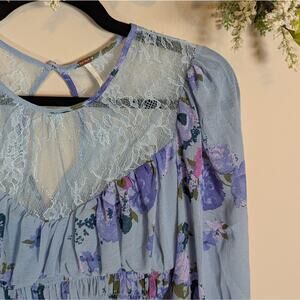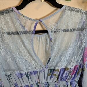 Free People Blue Floral Lace Long Sleeve Crop Top Blouse