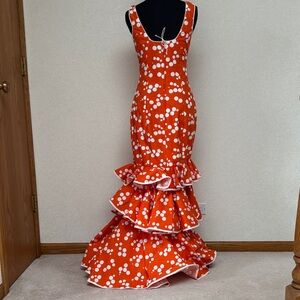This bespoke traditional flamenco dress was created at the famous Maty’s dress shop in Madrid, Spain. Unfortunately it only fit my late-20’s body. Zippered closure, eyelet hook and string tie in back to secure the bodice). Shoes, hair piece, flower and earrings for display purposes only, and not included in purchase).