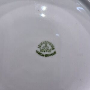 This vintage 1920s Leuchtenburg cake plate from Germany features a pearlescent finish on round porcelain with a 9-inch diameter. It is an antique piece with scalloped edges, handles for easy serving, and a glossy finish. The plate is adorned with a carnival glass production style and bears a printed backstamp, showcasing its originality and authenticity. Perfect for all occasions, this multicolor cake plate exudes elegance and charm, making it a stunning addition to any collection.