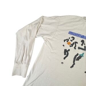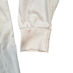Rare find. This shirt shows some wear and has pink/reddish dye transfer, likely from being washed with colors. There are also two small spots that appear to be paint—these may peel off with care. I personally like the vintage, distressed look, but please review all photos closely and use your best judgment before purchasing. Item is sold as-is.