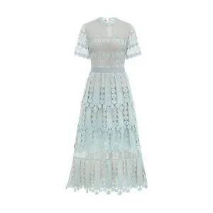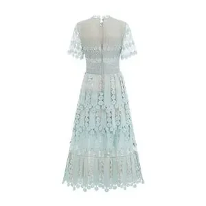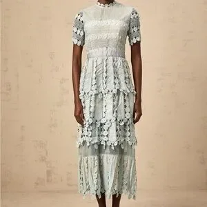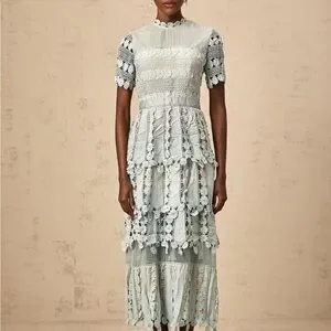 This elegant lace midi dress features intricate detailing and a sophisticated light gray hue. Perfect for any special occasion, it offers a timeless and graceful look.