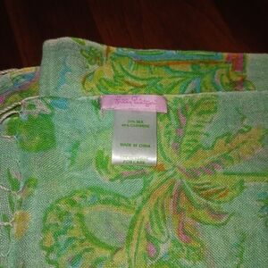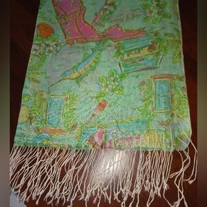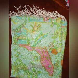 Lilly's tribute to Florida! Cheerful vignettes of Florida icons, all on a soft sea green background with fluttery fringe to finish the look. Ultra soft silk and cashmere blend, in excellent used condition. Lilly brand label present. Comes from a smoke free, pet friendly (bunny) home. Questions? Ask away!