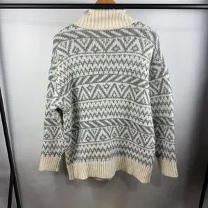 Cozy and soft Aerie half-zip pullover featuring a wintery Fair Isle geometric pattern in neutral cream and gray tones. Perfect for layering through chilly days — the oversized collar and ring-zip detail add a modern touch to this classic cold-weather look.