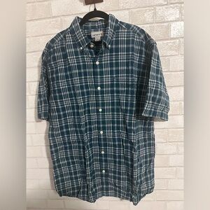 Built for comfort and durability, this Carhartt button-up features a classic plaid pattern in deep green, blue, and white tones. The short sleeves and lightweight cotton blend make it ideal for warm weather or layering under a jacket. With a crisp collar and full button front, it’s a versatile piece for workwear or casual styling.