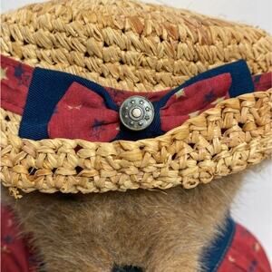 This precious plush limited edition teddy bear is dressed in a patriotic dress with stars and a denim coverall along with blue underpants.