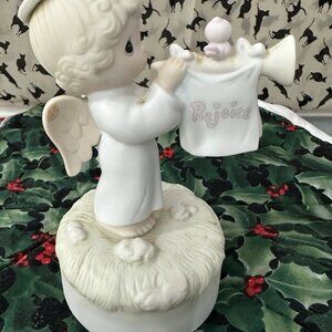 This one is a Christmas figurine and a music box. It is called Rejoice O Earth, from 1981. The music box plays Joy to the World, and features an angel playing a Rejoice horn with a little bird.
