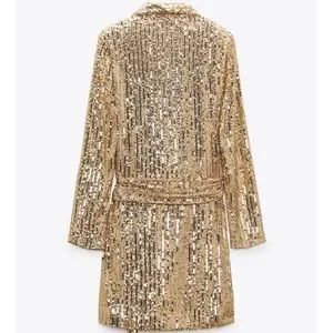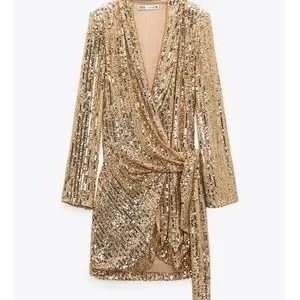 Elegant Zara dress with shimmering gold sequins. Features long sleeves and a wrap design. Ideal for evening events.