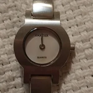 Cartier ( CC771120) quartz watch with a stainless steel finish, and has a beautiful glass cover. Simple and elegant design. still has plastic on back